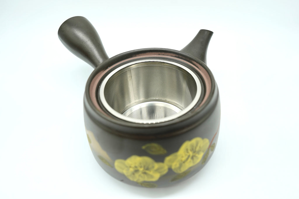 Elevate your tea ritual with the exquisite Mito Kyusu, a teapot that exudes elegance and artistry. This teapot is characterised by its stunning design, adorned with intricate gold flowers and a mountain motif set against a rich, dark brown backdrop.
